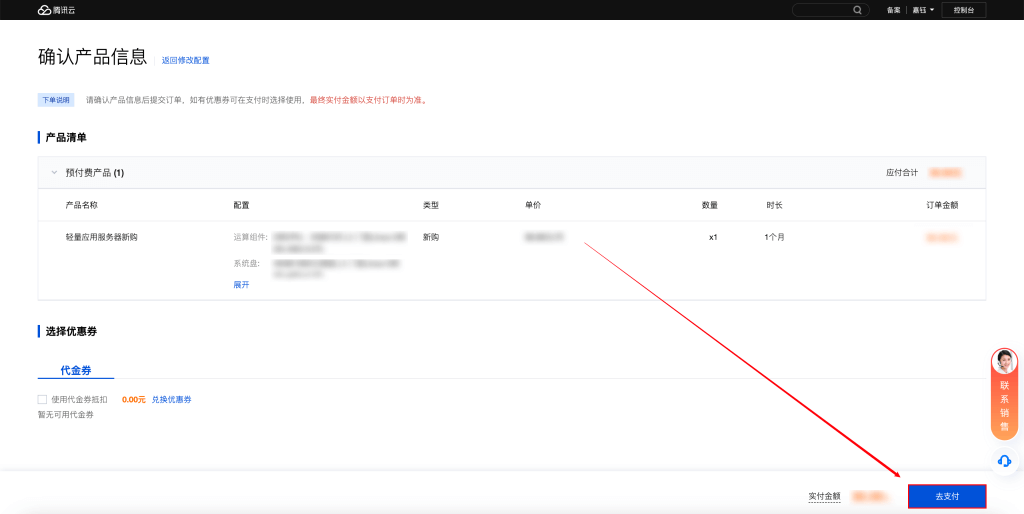 3、确认产品信息,并在页面右下角点击“去支付”。