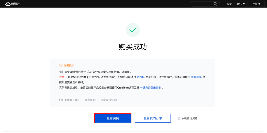 5、支付成功后,您将来到支付成功页,点击“查看实例”,即可前往轻量应用服务器控制台查看刚刚购买的服务器。