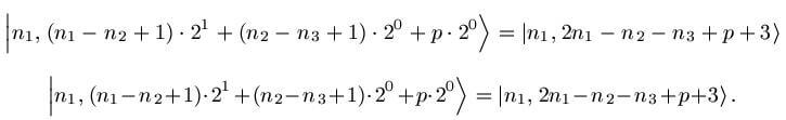 \Ket{n_1,(n_1\!-\!n_2\!+\!1)\!\cdot\!2^1\!+\!(n_2\!-\!n_3\!+\!1)\!\cdot\!2^0\!+\!p\!\cdot\!2^0} =\Ket{n_1,2n_1\!-\!n_2\!-\!n_3\!+\!p\!+\!3}\label{eq:4}.