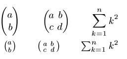 \tbinom{a}{b}\qquad\bigl(\begin{smallmatrix}a&b\\c&d\end{smallmatrix}\bigr)\qquad\begin{matrix}\sum_{k=1}^n k^2\end{matrix}
