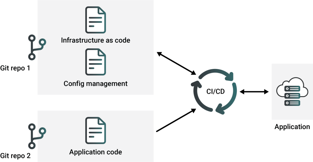 GitOps 利用版本控制的 git 存储库作为单一事实来源。 CD 管道控制云基础设施所需的声明性状态,并且合并到中央存储库中的更改会触发强制执行该状态的机制。
