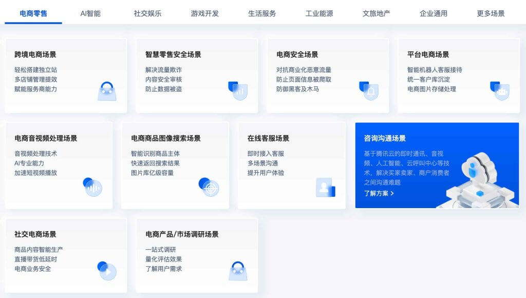 首先是一些腾讯云企业热门场景需求,一站式解决企业刚需难题,包括电商零售、AI 智能、社交娱乐、游戏开发、生活服务、工业能源、文旅地产等场景。