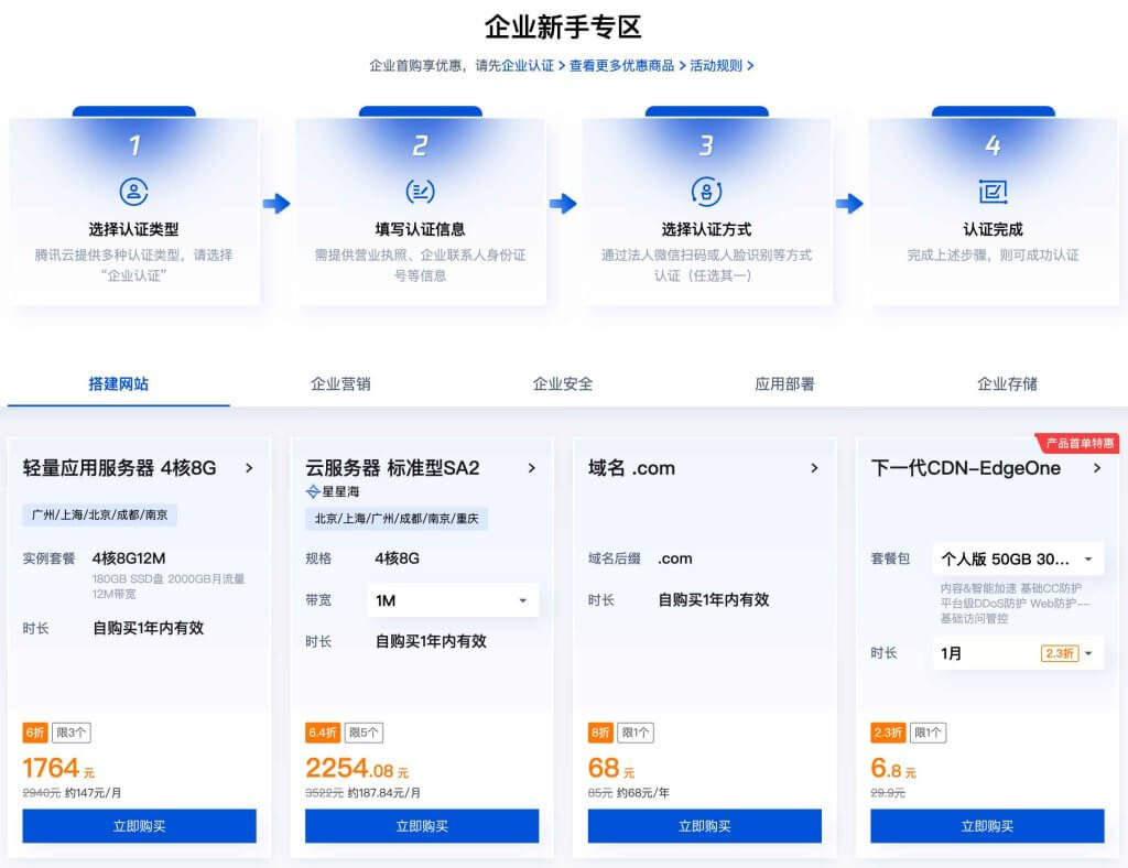 其次,针对企业新手,腾讯云也推出了企业新手专区,我们只需完成简单几步即可购买企业新用户专享优惠产品。