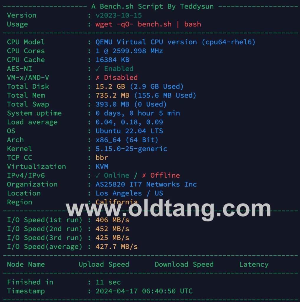 首先是性能测试,如下图所示,使用 bench.sh 测评脚本,测试结果来看硬盘读写速度表现还不错,但是测速节点目测是全部失效。