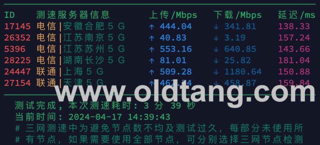 下面是单独进行的速度测试,可以看到仅有几个测速节点还能测出接过来,总体来看测速服务器似乎都不太好用了,老唐确实也很久没有关注这些测评了,最近花时间研究一下。