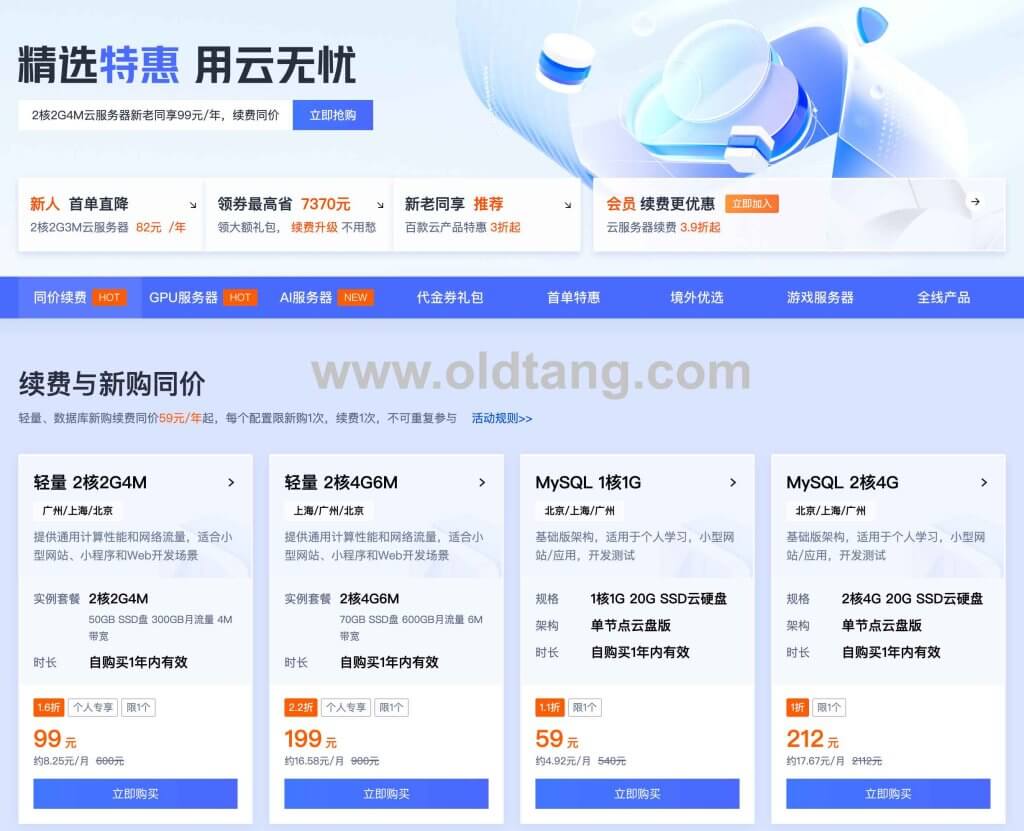 如图所示,第一款套餐就是这次的优惠套餐,配置为 2核2G4M,价格为 99 元/年,可以优惠价格再续费一次,然后老用户也可以购买。