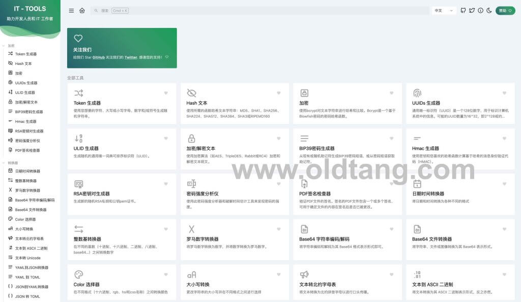 IT Tools 是一个非常好用的在线工具网站开源 GitHub 项目,功能丰富,包含 Token 生成器、Hash 文本等各种加密器,以及日期时间转换器、整数基数转换器等各种转换器,还有各种实用 Web 工具,图片和视频工具,开发工具等。本文分享一下 IT Tools 的安装方法,非常简单,docker 一键安装即可。