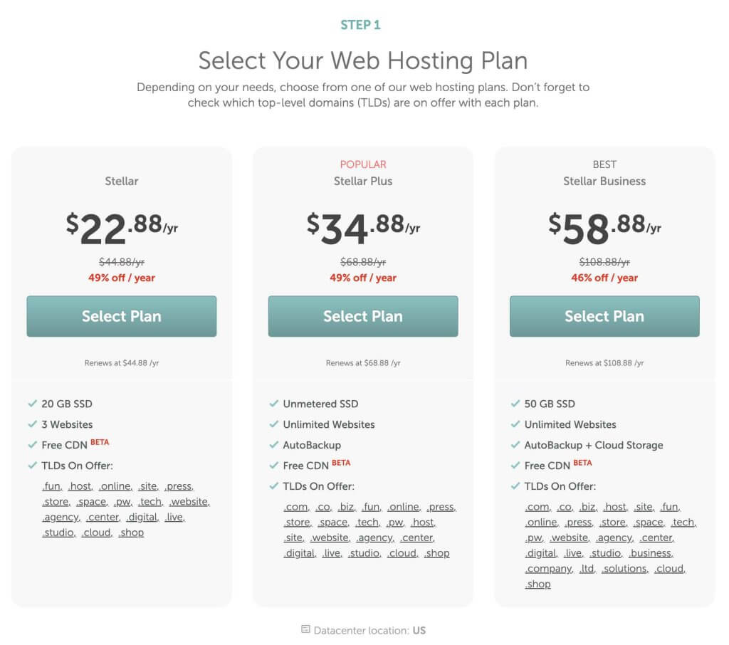 简单看了一下,一共有三种不同的套餐,最便宜的是 $22.88/年,可以免费赠送一个 .fun、.host 或者其他后缀的域名。如果需要免费赠送一个 .com 域名,那么最少需要购买中间那款 $34.88/年的虚拟主机。