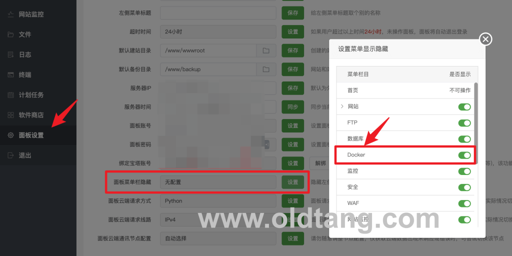 如下图所示,依次点击:面板设置 -> 面板菜单栏隐藏,然后把 Docker 勾选上,就可以在左侧菜单看到 Docker 入口了。
