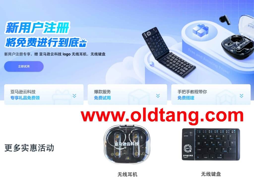 “新用户注册专享,赠亚马逊云科技 logo 无线耳机,无线键盘”活动