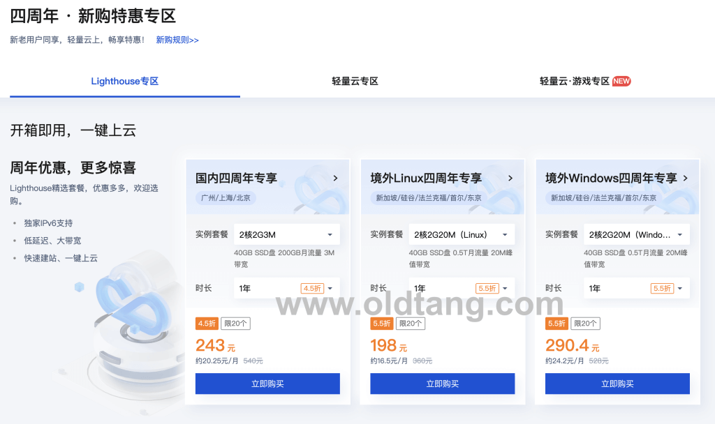我们简单看一下这次的活动内容,首先就是四周年的新购特惠专区,新老用户同享,轻量云上,畅享特惠,开箱即用,一键上云。这次四周年庆有好几款特惠方案,如下图所示,欢迎大家选购。