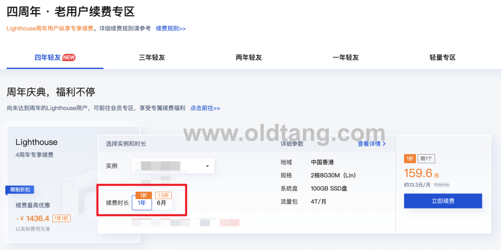 四周年老用户续费专区,这个是这次活动的主力,最给力的就是老用户续费一折优惠。如果你是四年轻友,也就是有一台轻量应用服务器已经超过 4 年,那么就可以按照一折的价格续费一台轻量应用服务器。如果是三年则是 1.5 折,以此类推,大家根据自己的年限对应的享受优惠就可以了。