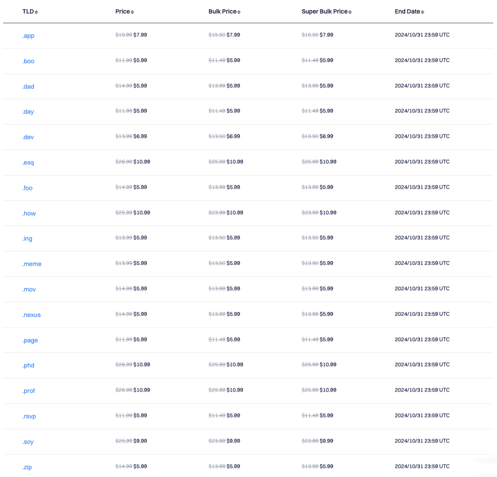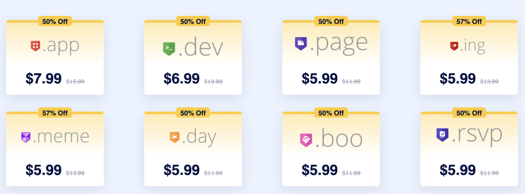 Dynadot 最近有一波优惠活动,针对 Google 公司旗下的域名后缀,目前可以享受五折的价格优惠,打完折之后仅需 $5.99/年起步,包括 .app、.dev、.page、.ing、.meme、.day、.boo、.rsvp 等多个后缀。这些后缀还是都挺有个性的,建议我们根据自己的喜好进行选购。