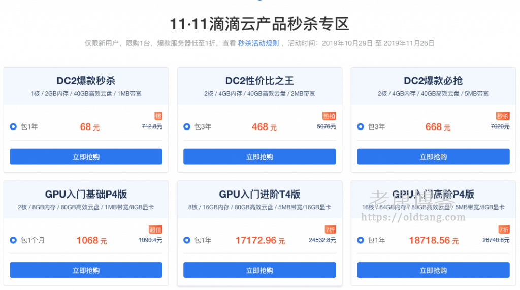 - 阿里云:双十一活动:1核 2G 1M 86元/年,1核 1G 1M 香港 119元/年,>> 点我直达 <<。