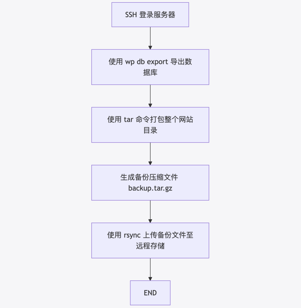 流程图说明:展示了使用命令行工具备份数据库及文件的步骤,从 SSH 登录到使用 tar 打包和 rsync 传输,实现对大型网站的高效备份.
