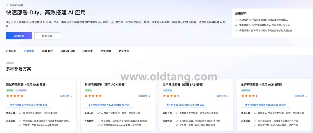 - 提供在阿里云上部署 Dify 的完整路线,支持测试与生产两种环境以及 SAE 与 ACK 两种技术栈。