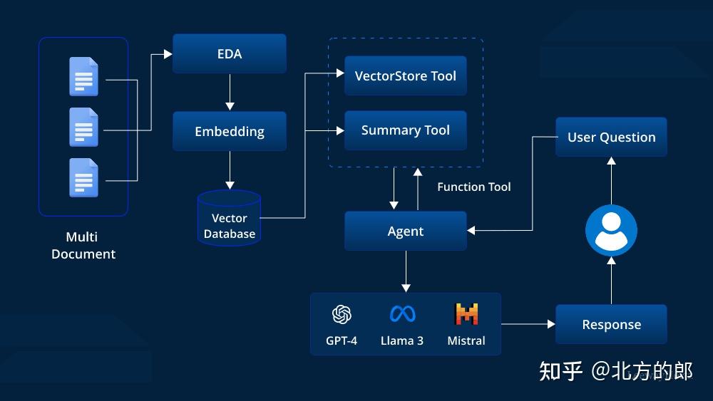 虽然标准RAG在跨多个文档的简单查询中表现出色,但Agentic RAG更进一步,成为问答领域的强大解决方案。它通过引入AI agents,增加了一层智能。这些agents作为自主决策者,分析初步发现并战略性地选择最有效的工具以进一步检索数据。这种多步推理能力使Agentic RAG能够处理复杂的研究任务,例如总结、跨多个文档比较信息,甚至提出后续问题——所有这些都以一种协调且高效的方式进行。这种新引入的agents将LLM从被动响应者转变为主动调查者,能够深入挖掘复杂信息并提供全面、合理的答案。Agentic RAG在此类应用中具有巨大潜力,使用户能够全面理解复杂主题,获得深刻见解并做出明智决策。