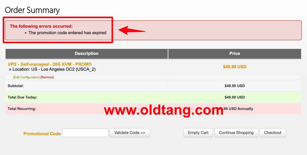 最近如果我们购买搬瓦工 VPS 的时候,想要输入优惠码,会发现提示已经过期了,然后尝试了很多个优惠码,发现全都过期了。那咋办,那好像也没啥办法,因为确实是全都过期了。本文仅仅分享一下搬瓦工优惠码已经全部过期这个事实,目前并没有新的优惠码,建议大家可以关注一下优惠通知频道。