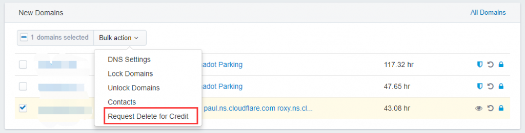 一般来说 Grace 的剩余时间大于 24 小时就可以进行自主删除。我们选择需要删除并退款的域名,比如我选择第三个: