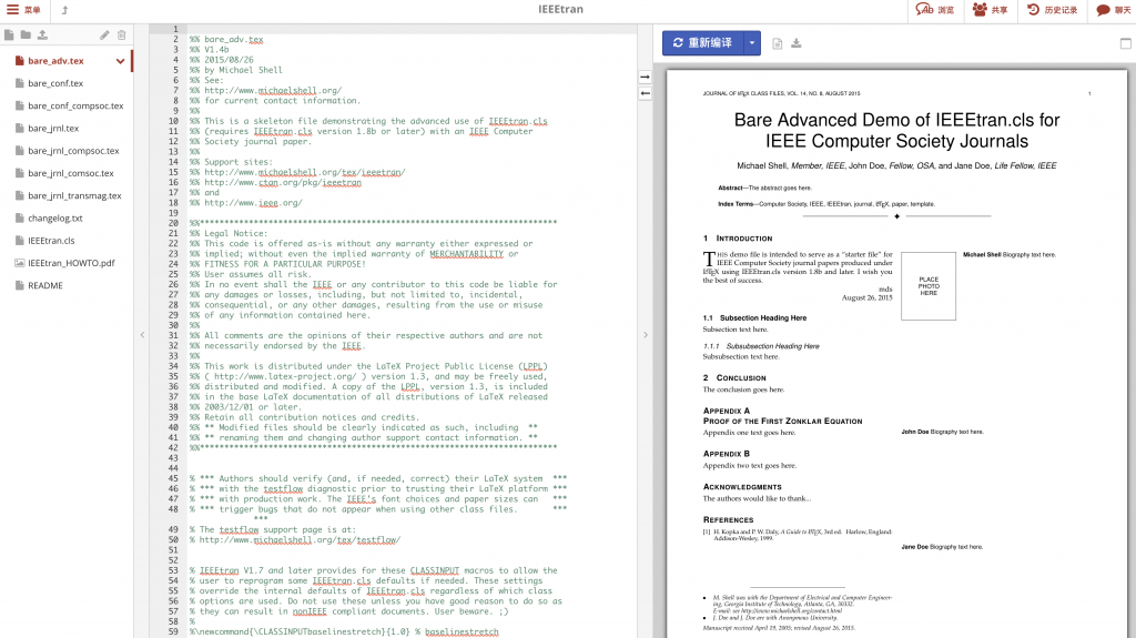 我上传了一个 IEEE 的会议协作模板,用 ShareLaTeX 打开是下面这样的: