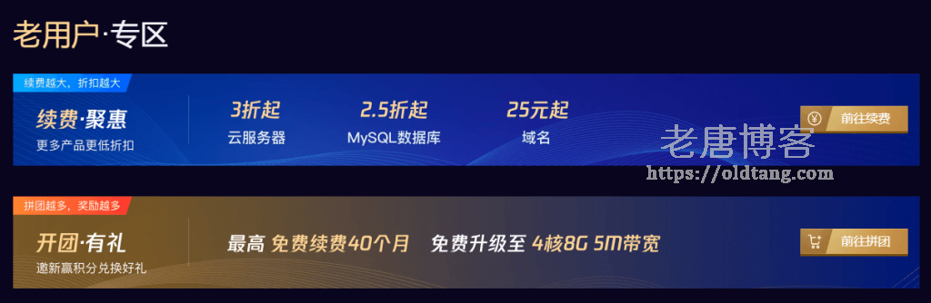 页面继续往下,就可以看到老用户优惠活动,老用户续费云服务器三折起,续费时间越长,折扣越低。续费域名 25 元起。
