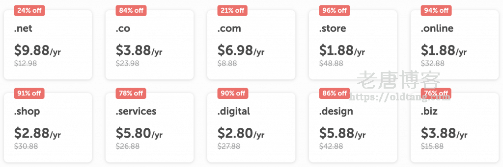 活动页面显示最高的折扣是 96% OFF,四舍五入不要钱了。我们可以看一下 NameCheap 域名优惠价格如下: