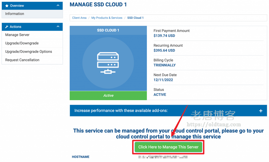 登录之后,可以看到我们已经购买的 VPS 列表,点击想更换 IP 的 VPS 后面的 Manage 按钮,如图所示。
