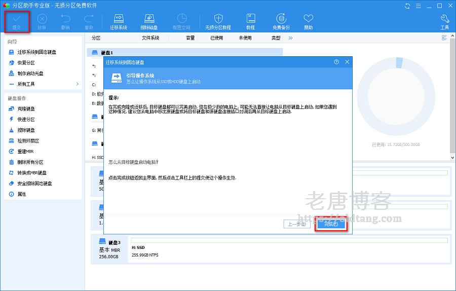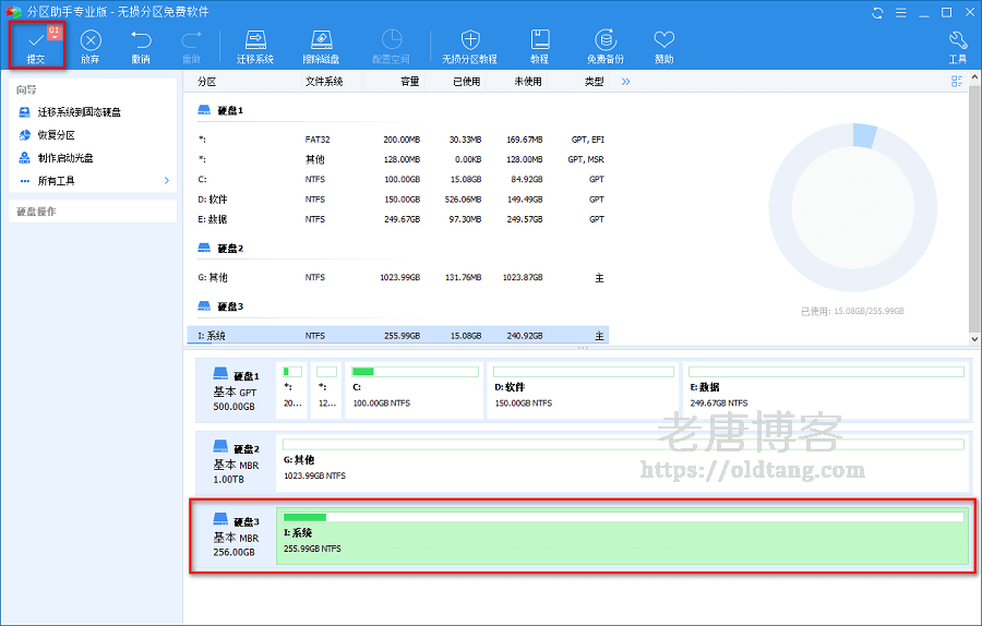 5、返回到分区助手主界面:您可以看到“等待执行的操作”一栏有一个新操作。点击主界面左上角“提交”,并根据软件的提示,完成您的系统盘迁移操作。