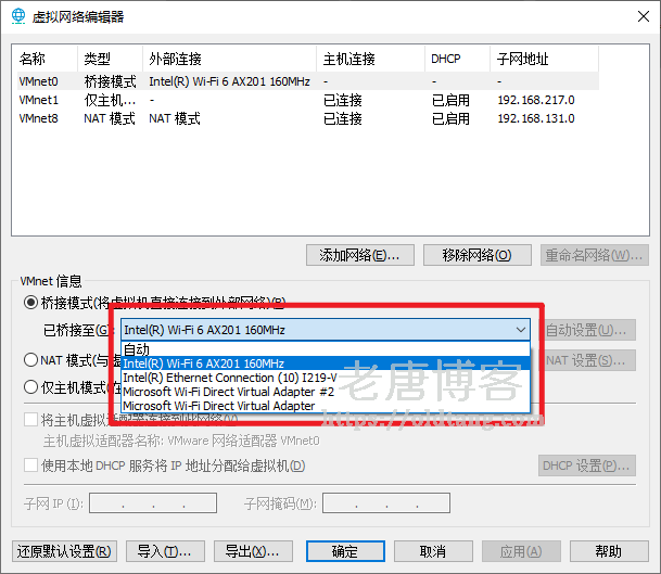 之后可以看到 VMnet0 这个网络,默认选择了桥接模式,我们需要改的是把已桥接至后面的网络改成 WiFi 网卡,默认是自动的。
