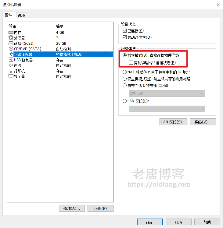 然后确认一下虚拟机的配置,是否是桥接模式,如图所示。如果是的话,一切就 OK 了,重启一下虚拟机即可。