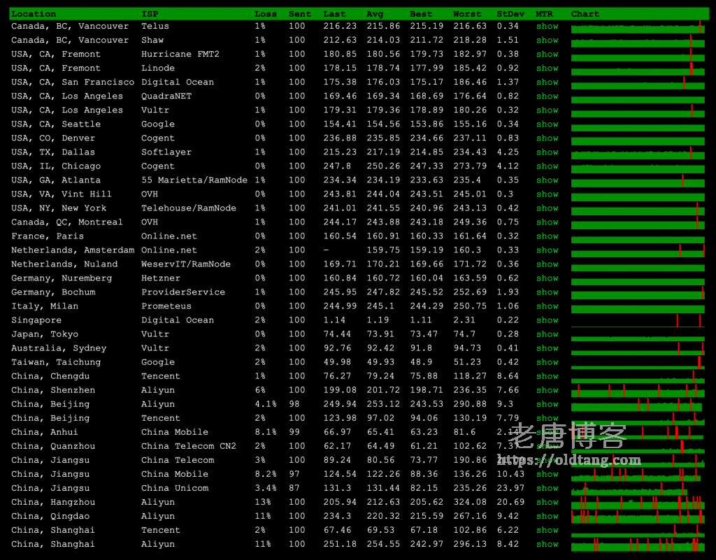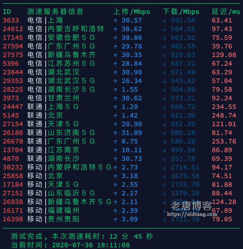 ---------------------------------------------------------------------- 广州电信 traceroute to 14.215.116.1 (14.215.116.1), 30 hops max, 60 byte packets 1 9.40.156.130 6.66 ms * 美国 ibm.com 2 9.40.182.38 60.96 ms * 美国 ibm.com 3 * 4 10.196.7.69 5.34 ms * 局域网 5 10.200.17.30 0.91 ms * 局域网 6 203.129.13.13 0.77 ms AS4809 新加坡 电信 7 59.43.183.125 1.24 ms * 中国 电信 8 59.43.189.205 40.95 ms * 中国 广东 广州 电信 9 * 10 59.43.130.125 42.63 ms * 中国 广东 广州 电信 11 202.97.82.34 53.41 ms AS4134 中国 广东 广州 电信 12 183.59.12.85 43.45 ms AS58543 中国 广东 广州 电信 13 183.56.129.2 43.84 ms AS58543 中国 广东 广州 电信 14 14.215.116.1 44.45 ms AS58543 中国 广东 广州 电信 ---------------------------------------------------------------------- 上海电信 traceroute to 101.95.120.109 (101.95.120.109), 30 hops max, 60 byte packets 1 9.40.156.130 4.45 ms * 美国 ibm.com 2 9.40.180.254 34.85 ms * 美国 ibm.com 3 10.196.77.1 5.07 ms * 局域网 4 10.196.7.61 1.12 ms * 局域网 5 10.200.17.30 0.57 ms * 局域网 6 203.129.13.13 0.77 ms AS4809 新加坡 电信 7 59.43.183.125 1.30 ms * 中国 电信 8 59.43.249.234 64.45 ms * 中国 上海 电信 9 59.43.187.65 64.12 ms * 中国 上海 电信 10 59.43.130.205 71.60 ms * 中国 上海 电信 11 101.95.88.34 64.58 ms AS4812 中国 上海 电信 12 101.95.120.109 73.06 ms AS4812 中国 上海 电信 ---------------------------------------------------------------------- 厦门电信 traceroute to 117.28.254.129 (117.28.254.129), 30 hops max, 60 byte packets 1 9.40.156.129 5.98 ms * 美国 ibm.com 2 9.40.182.36 12.85 ms * 美国 ibm.com 3 10.196.77.5 6.60 ms * 局域网 4 10.196.7.61 1.05 ms * 局域网 5 10.200.17.34 0.97 ms * 局域网 6 218.185.242.153 1.54 ms AS4809 新加坡 电信 7 59.43.250.105 1.20 ms * 新加坡 电信 8 59.43.182.134 40.90 ms * 中国 广东 广州 电信 9 * 10 59.43.130.101 43.46 ms * 中国 广东 广州 电信 11 59.43.142.30 57.65 ms * 中国 电信 12 27.159.81.254 73.60 ms AS133775 中国 福建 厦门 电信 13 * 14 * 15 117.28.254.129 68.02 ms AS133775 中国 福建 厦门 电信 ---------------------------------------------------------------------- 重庆联通 traceroute to 113.207.25.138 (113.207.25.138), 30 hops max, 60 byte packets 1 9.40.156.129 4.79 ms * 美国 ibm.com 2 9.40.182.36 15.07 ms * 美国 ibm.com 3 10.196.77.13 6.67 ms * 局域网 4 10.196.7.65 4.82 ms * 局域网 5 10.200.17.26 0.83 ms * 局域网 6 203.208.169.53 0.43 ms AS7473 新加坡 singtel.com 7 203.208.152.82 1.58 ms AS7473 新加坡 singtel.com 8 203.208.149.138 0.77 ms AS7473 新加坡 singtel.com 9 203.208.171.61 44.27 ms AS7473 中国 广东 广州 singtel.com 10 219.158.97.26 41.39 ms AS4837 中国 广东 广州 联通 11 219.158.24.125 79.56 ms AS4837 中国 广东 广州 联通 12 219.158.21.242 109.74 ms AS4837 中国 重庆 联通 13 113.207.25.138 101.34 ms AS4837 中国 重庆 联通 ---------------------------------------------------------------------- 成都联通 traceroute to 119.6.6.6 (119.6.6.6), 30 hops max, 60 byte packets 1 9.40.156.129 4.72 ms * 美国 ibm.com 2 9.40.182.36 24.50 ms * 美国 ibm.com 3 * 4 10.196.7.69 1.04 ms * 局域网 5 10.200.17.30 0.90 ms * 局域网 6 203.208.169.49 0.41 ms AS7473 新加坡 singtel.com 7 203.208.152.82 1.04 ms AS7473 新加坡 singtel.com 8 203.208.149.138 0.74 ms AS7473 新加坡 singtel.com 9 203.208.171.61 43.23 ms AS7473 中国 广东 广州 singtel.com 10 219.158.103.37 48.66 ms AS4837 中国 广东 广州 联通 11 219.158.8.121 42.01 ms AS4837 中国 广东 广州 联通 12 219.158.102.186 77.13 ms AS4837 中国 四川 成都 联通 13 119.6.197.174 81.60 ms AS4837 中国 四川 成都 联通 14 119.7.220.218 82.14 ms AS4837 中国 四川 成都 联通 15 119.6.6.6 75.84 ms AS4837 中国 四川 成都 联通 ---------------------------------------------------------------------- 上海移动 traceroute to 183.192.160.3 (183.192.160.3), 30 hops max, 60 byte packets 1 9.40.156.130 6.83 ms * 美国 ibm.com 2 9.40.180.254 43.17 ms * 美国 ibm.com 3 * 4 10.196.7.65 1.00 ms * 局域网 5 10.200.17.22 0.59 ms * 局域网 6 203.208.169.49 0.48 ms AS7473 新加坡 singtel.com 7 203.208.172.94 0.60 ms AS7473 新加坡 singtel.com 8 203.208.158.186 0.67 ms AS7473 新加坡 singtel.com 9 203.208.158.18 0.72 ms AS7473 新加坡 singtel.com 10 203.208.183.249 1.11 ms AS7473 新加坡 singtel.com 11 203.208.173.85 40.59 ms AS7473 SINGTEL.COM 骨干网 singtel.com 12 203.208.178.18 45.92 ms AS7473 中国 香港 singtel.com 13 * 14 223.120.2.117 46.62 ms AS58453 中国 香港 移动 15 * 16 223.120.2.2 53.14 ms AS58453 中国 广东 广州 移动 17 223.120.22.5 82.98 ms AS58453 中国 广东 广州 移动 18 * 19 221.183.25.193 88.80 ms AS9808 中国 上海 移动 20 221.183.23.37 85.32 ms AS9808 中国 上海 移动 21 * 22 221.183.53.225 86.09 ms AS9808 中国 上海 移动 23 221.183.60.50 85.37 ms AS9808 中国 移动 24 120.204.194.14 97.96 ms AS24400 中国 上海 移动 25 * 26 * 27 * 28 * 29 * 30 * ---------------------------------------------------------------------- 成都移动 traceroute to 183.221.253.100 (183.221.253.100), 30 hops max, 60 byte packets 1 9.40.156.129 5.49 ms * 美国 ibm.com 2 9.40.182.36 44.35 ms * 美国 ibm.com 3 10.196.77.13 5.81 ms * 局域网 4 10.196.7.65 0.90 ms * 局域网 5 10.200.17.22 1.03 ms * 局域网 6 203.208.169.49 0.47 ms AS7473 新加坡 singtel.com 7 203.208.172.94 0.58 ms AS7473 新加坡 singtel.com 8 203.208.158.186 0.63 ms AS7473 新加坡 singtel.com 9 203.208.158.18 0.71 ms AS7473 新加坡 singtel.com 10 203.208.171.229 37.03 ms AS7473 SINGTEL.COM 骨干网 singtel.com 11 203.208.178.18 40.38 ms AS7473 中国 香港 singtel.com 12 203.208.152.190 35.93 ms AS7473 中国 香港 singtel.com 13 223.120.2.117 41.49 ms AS58453 中国 香港 移动 14 223.120.2.86 39.94 ms AS58453 中国 广东 广州 移动 15 221.183.55.78 62.15 ms AS9808 中国 广东 广