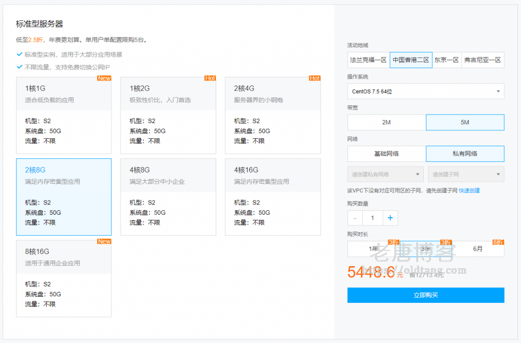 目前活动分为新用户和老用户,新用户折扣力度比较大,最低是 1.8 折,老用户的话最低是 3 折,其实也差不了多少。推荐购买配置高一些的方案,性价比更高一些。比如下面这个是老唐认为的新用户性价比比较高的方案,老唐自己也买了一台。