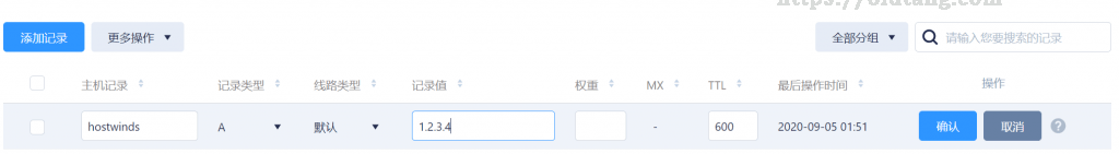 第一件事就是把我们的域名解析到 Hostwinds 的 VPS 的 IP 地址。推荐我们使用 DNSPod 或者 Cloudflare,都是非常好用的免费 DNS 服务商。这里以 DNSPod 为例,添加解析记录即可,如图所示。