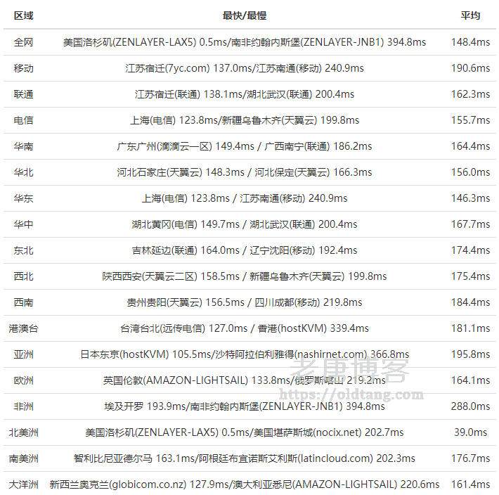 ---------------------------------------------------------------------- 上海移动 traceroute to 183.192.160.3 (183.192.160.3), 30 hops max, 60 byte packets 1 * 2 218.30.48.61 1.01 ms AS4134 美国 加利福尼亚州 洛杉矶 电信 3 59.43.189.33 165.14 ms * 中国 上海 电信 4 * 5 * 6 59.43.80.78 131.12 ms * 中国 上海 电信 7 202.97.46.58 130.20 ms AS4134 中国 上海 电信 8 221.183.66.157 156.04 ms AS9808 中国 上海 移动 9 221.176.22.37 156.04 ms AS9808 中国 上海 移动 10 221.183.62.222 156.78 ms AS9808 中国 上海 移动 11 117.143.13.70 159.37 ms AS24400 中国 上海 移动 12 120.204.194.14 165.92 ms AS24400 中国 上海 移动 13 120.204.197.126 158.01 ms AS24400 中国 上海 移动 ---------------------------------------------------------------------- 成都移动 traceroute to 183.221.253.100 (183.221.253.100), 30 hops max, 60 byte packets 1 * 2 218.30.48.61 0.93 ms AS4134 美国 加利福尼亚州 洛杉矶 电信 3 59.43.182.78 195.40 ms * 中国 广东 广州 电信 4 * 5 * 6 202.97.55.170 179.54 ms AS4134 中国 广东 广州 电信 7 202.97.36.226 205.90 ms AS4134 中国 四川 成都 电信 8 * 9 221.183.66.73 217.09 ms AS9808 中国 四川 成都 移动 10 221.176.20.221 216.18 ms AS9808 中国 四川 成都 移动 11 221.183.19.46 218.45 ms AS9808 中国 四川 成都 移动 12 111.9.130.38 218.42 ms AS9808 中国 四川 成都 移动 13 223.87.85.50 218.61 ms AS9808 中国 四川 成都 移动 14 183.221.253.100 216.41 ms AS9808 中国 四川 成都 移动 ----------------------------------------------------------------------