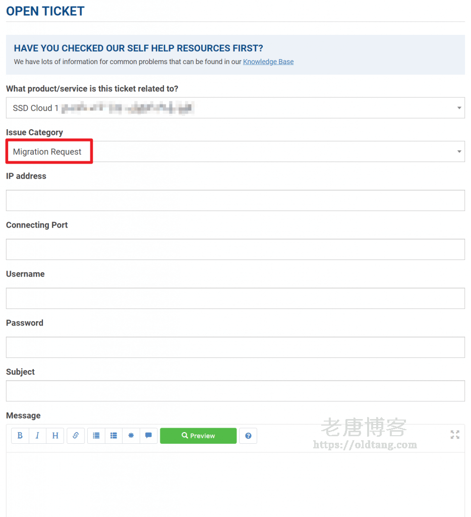 然后我们填写我们原来的 VPS 的 IP 地址、端口号、用户名、密码,并且填写工单主题和你的一些迁移要求等,填完之后就可以提交了。