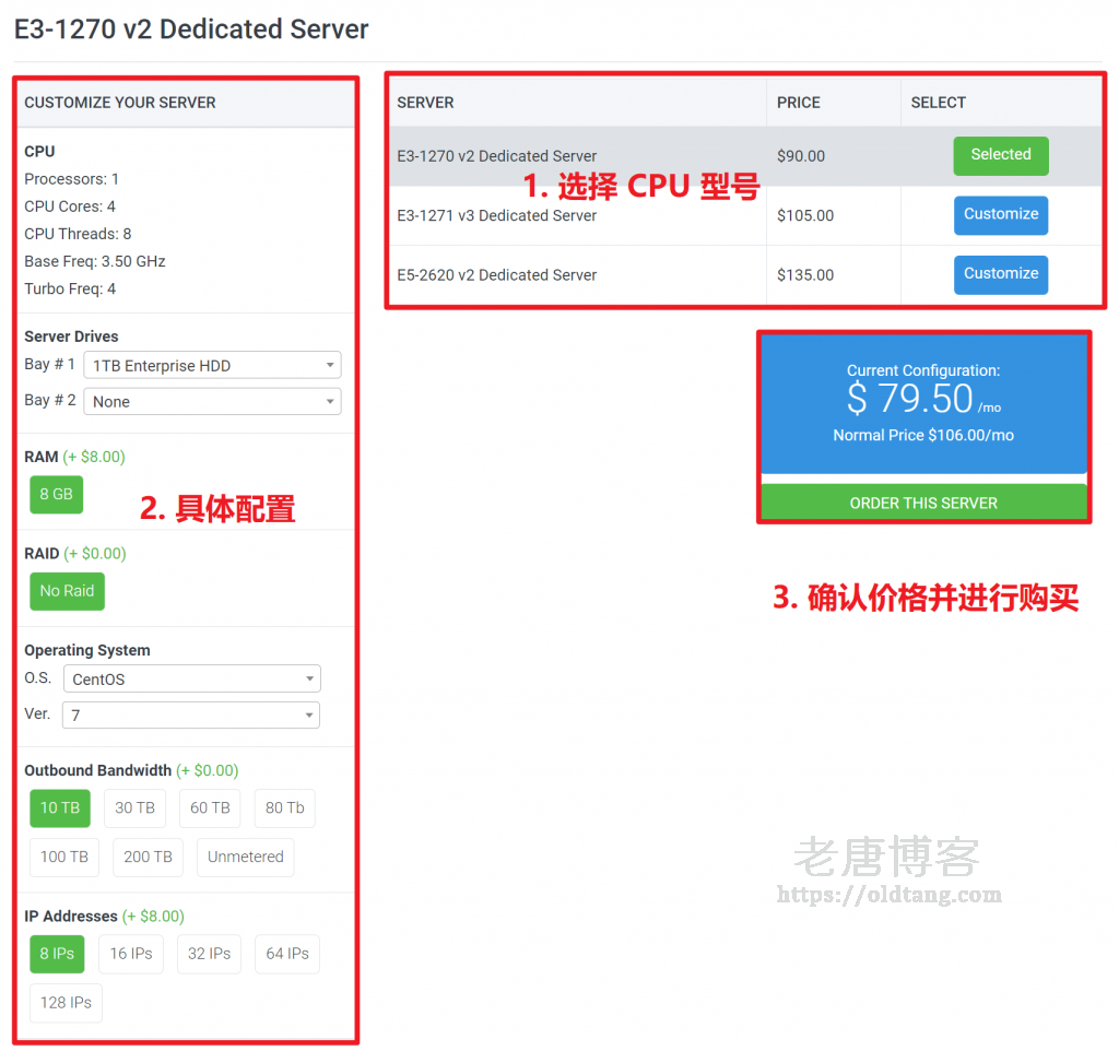 我们首先选择 CPU 型号,选择之后,就可以在左侧选择具体的配置了,能自定义的选项还是挺多的,包括硬盘、内存、RAID 选项、操作系统、流量、IP 地址等。