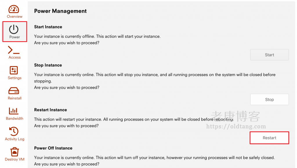 修改完之后,他会提示你直到重启后才会生效,我以为是要等我下次手动重启,结果发现改完后连不上了。所以我们需要在后台重启一下才行。重启的方法也很简单,点击 Power,然后点击 Restart 就行了。