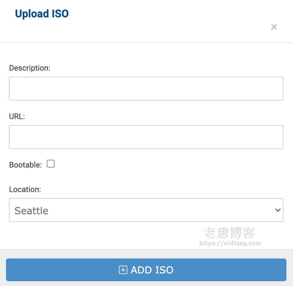 点击上面的 Create Volume,会弹出一个 Upload ISO 的窗口,我们输入描述和 ISO 的链接地址即可。