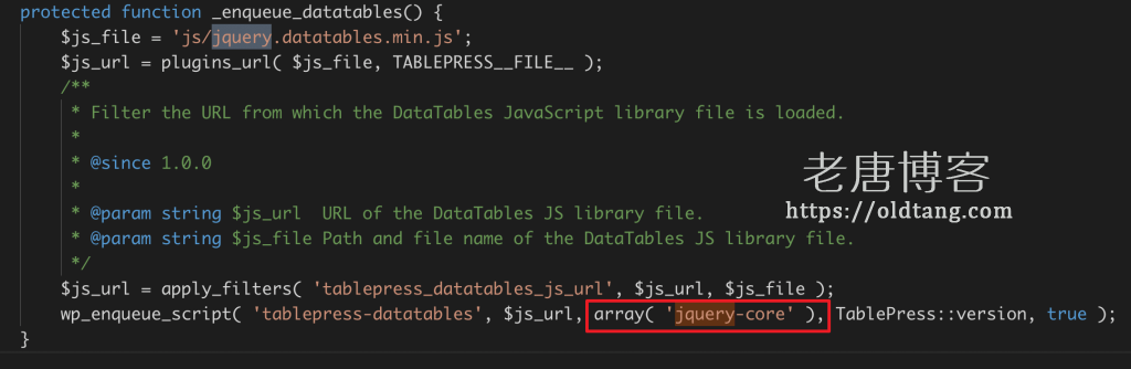 也就是说,要加载这个 script,需要依赖这个 array() 里的脚本,而 TablePress 这里写了要依赖 jQuery,所以每次加载 TablePress 的 jquery.datatables.min.js 之前,都会加载一下 jQuery,这就是问题的关键了。