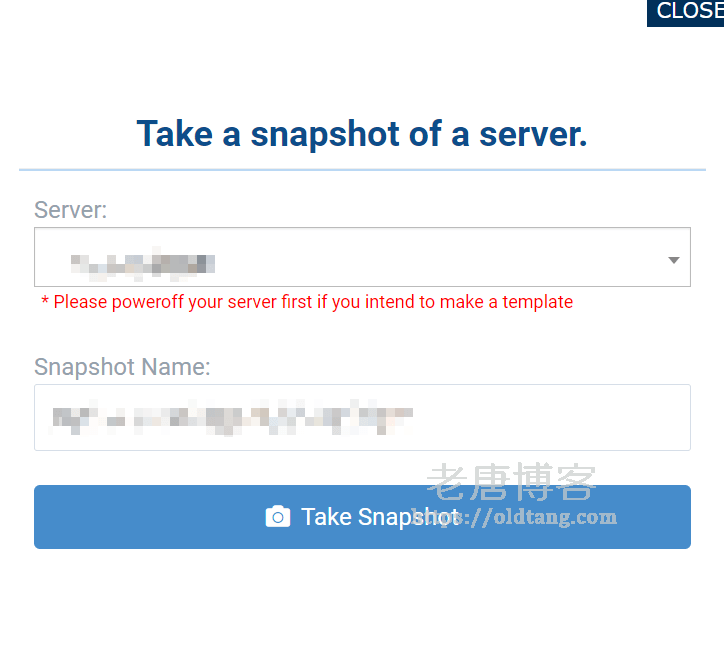 然后再点击 Create Snapshot,就会弹出一个对话框,选择想要创建快照的服务器,以及输入一个快照名,点击 Take Snapshot 就可以创建了。