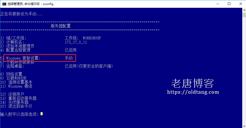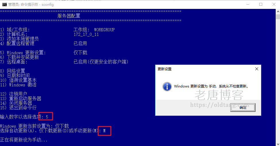 看一看检查一下 5 后面的选项,也就是 Windows 更新设置(英文为:Windows Update Settings)后面的选项,如果不是手动(Manually),那么我们输入 5,然后回车,回车之后再输入 M,然后再次回车,即可修改为手动更新,这样就关闭了自动更新了,Windows 不会自动更新,也不会自动下载更新,只有我们手动检查更新的时候才会进行更新检查。