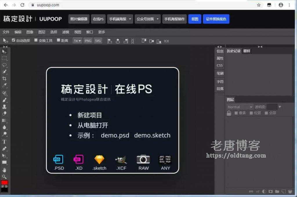 这个是老唐自己使用过的一个网站,由国外大神开发的一款在线 PS 设计软件,支持的格式包括 PSD、XD、Sketch、XCF、RAW 以及几乎所有图片格式。网站完美支持中文,非常好用。