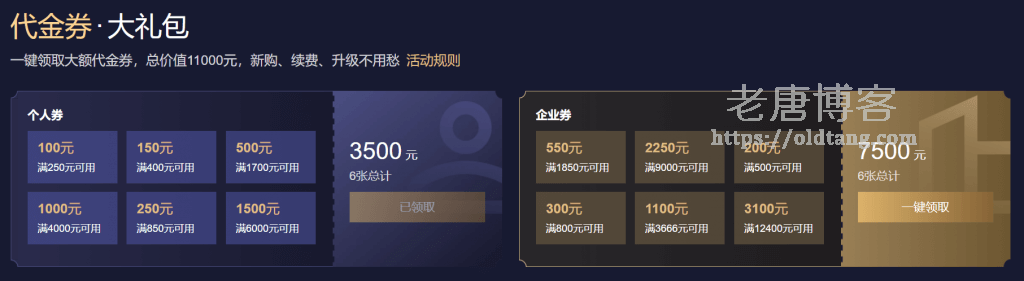 最后就是代金券大礼包了,个人用户和企业用户都可以领取腾讯云代金券,大额代金券,总价值好几千元,建议领取。新购、续费、升级都可以使用。(点击参与活动)