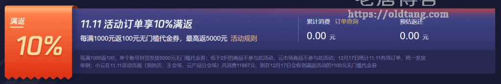 除了上面的秒杀,还有满返活动,每满 1000 元返 100 元无门槛代金券。需要注意的是,只有新购参与活动,并且新购的折扣力度需要高于 2 折。续费产品是不参与满返活动的。(点击参与活动)