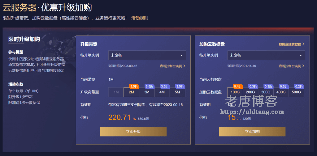 这是针对老用户的活动,如果你账户内已经有服务器了,那么完全可以通过这个活动升级配置。因为升级配置是非常优惠的,主要包括升级带宽和加购云数据盘,云数据盘买 500G 只需要 50 元一年,这个力度也没谁了。(点击参与活动)