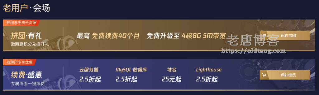 腾讯云一直都被成为良心云,既然是良心云,对于老用户肯定要有活动的。这次主要包括拼团有礼活动和续费活动,老唐比较推荐的是续费活动,续费云服务器 2.5 折,续费域名也可以享受六折或者七折,非常推荐续费域名!非常划算,老唐续费了 10 个域名,基本都续满了 10 年。(点击参与活动)