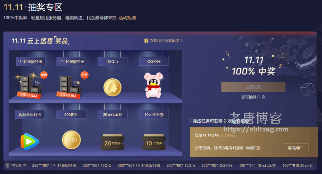 100% 中奖,包括轻量应用服务器、精美周边、代金券等,还有腾讯云积分。腾讯云积分可以兑换腾讯云代金券等,如果抽中积分,可以根据提示去换取腾讯云无门槛代金券。(点击参与活动)