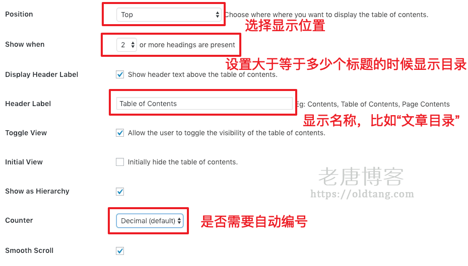- 设置显示名称,如果是中文网站,可以把 “Table of Contents” 改成 “文章目录”。