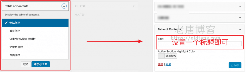除了设置在文章和页面显示之外,我们还可以设置小工具,比如如果把小工具添加到侧边栏,那么就可以在侧边栏显示文章目录。如下图所示,添加起来非常简单。