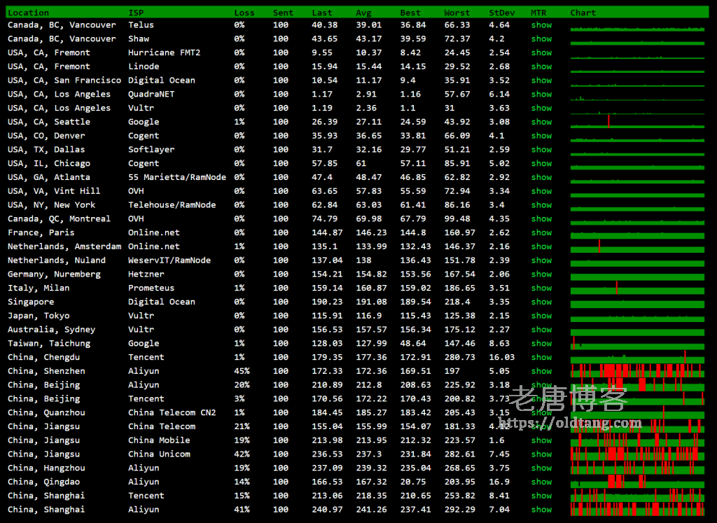 搬瓦工 DC3 CN2 延迟测试如下,全网延迟,大陆地区延迟还不错,基本都在 200ms 以内,这算是比较低的延迟了。当然,不能和 CN2 GIA 比,但是也是属于正常的 CN2 GT 线路延迟了。